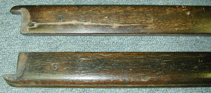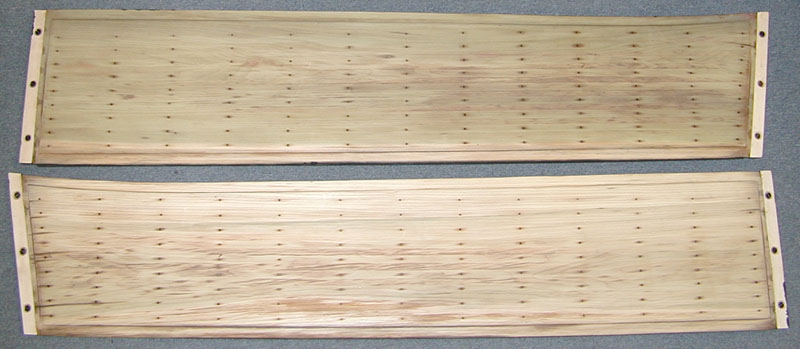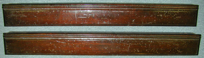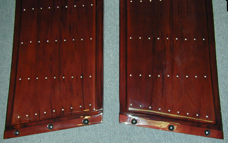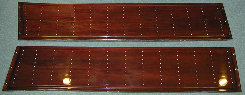 Here are the running boards from this 1936 Brewster. The old finish has been stripped off in preparation for refinishing. |