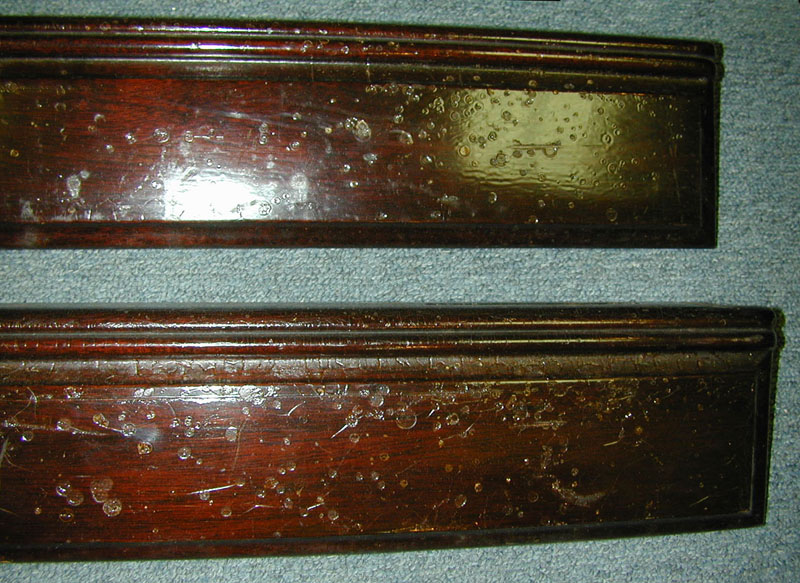 Here is a close-up of the 1936 Brewster door cappings and you can see that the finish shrunk and blistered everywhere. |